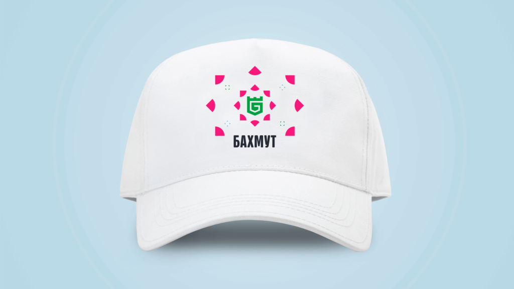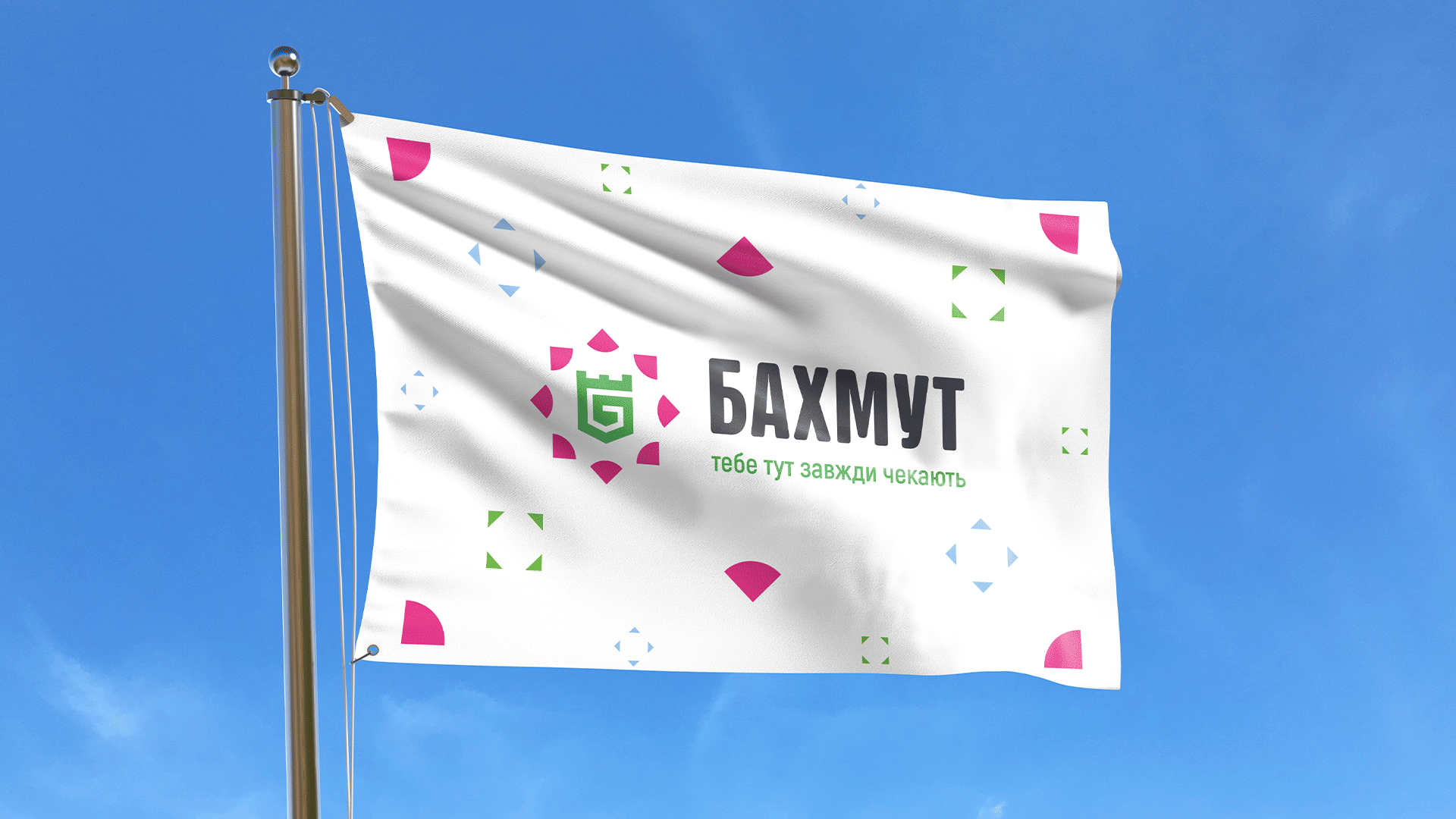 В центрі логотипу — стилізована перша буква назви міста Бахмут. Верхня частина букви нагадує фортецю, що ілюструє потужність громади і пов’язує логотип з концепцією позиціонування.