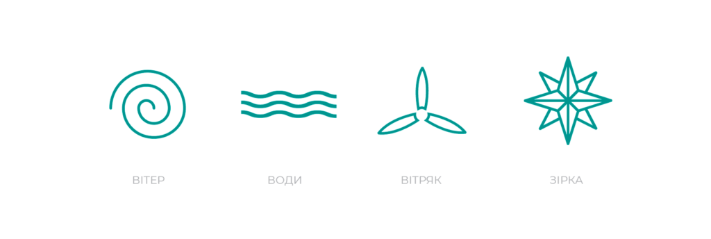 Стоїть зірка на ніжці, що разом формують образ вітрогенератора, що говорить про потужну Розу Вітрів, про традиційні вітряні млини, про сучасні технології та відновлювальну енергетику.
